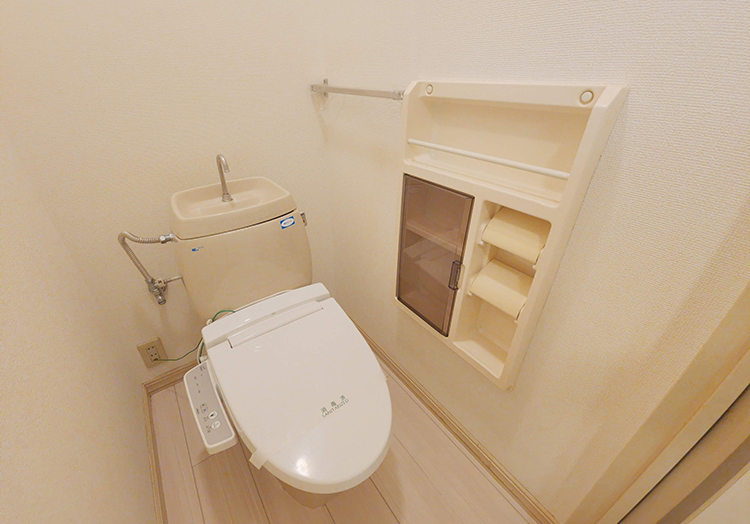 トイレにはウォシュレットとラックが付いておりトイレットペーパーや洗剤などが収納できます!