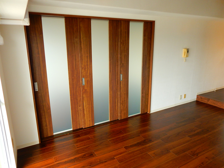 バルコニーに面したリビング横のお部屋で、独立したお部屋が確保できました。押入れをオープンな収納に作り替え、ロールカーテンで目隠し。