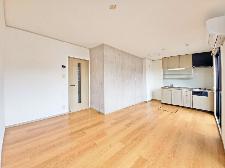大きな窓があり明るい日差しが差し込むリビングダイニング。アクセントクロスを木目調にすることで普通のキッチンも一気におしゃれになりました。ストック等も収納できる床下収納もあります。
