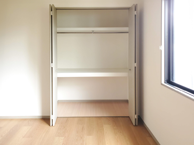 もう一つの洋室にも収納スペースがあり、洋服も楽に片付けられ、管理がしやすいです。アクセントクロスに優しいグレーを使用。木目調の床と落ち着いた雰囲気で、安らぎを感じる部屋です。